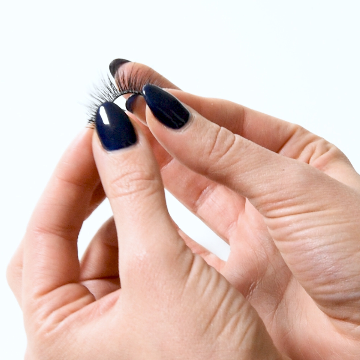 After removing from the tray, align the band with your natural lash line, and measure to fit the length of your own lash line. Using small scissors, trim off excess from the outer corner, if needed so that the lash style is maintained.