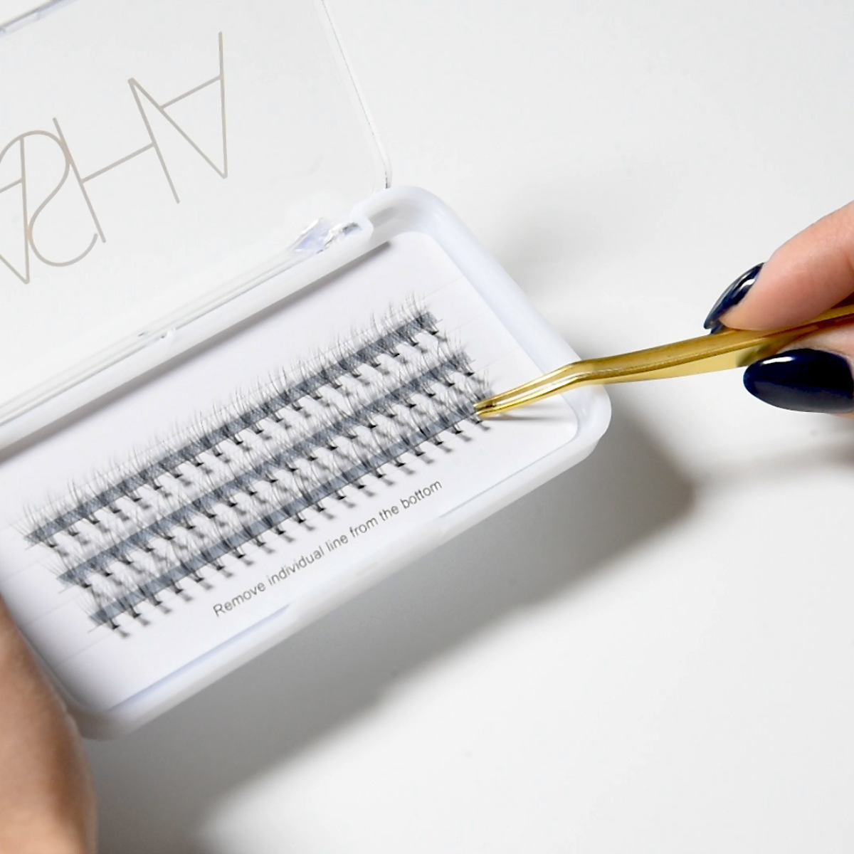 Start by gently removing the lashes from the tray with our eyelash applicator at the cotton band, avoid pulling individual strands.